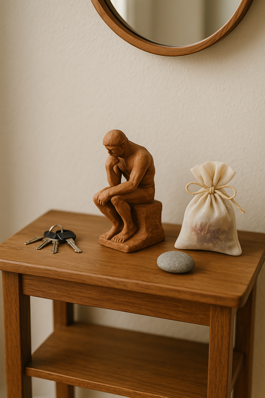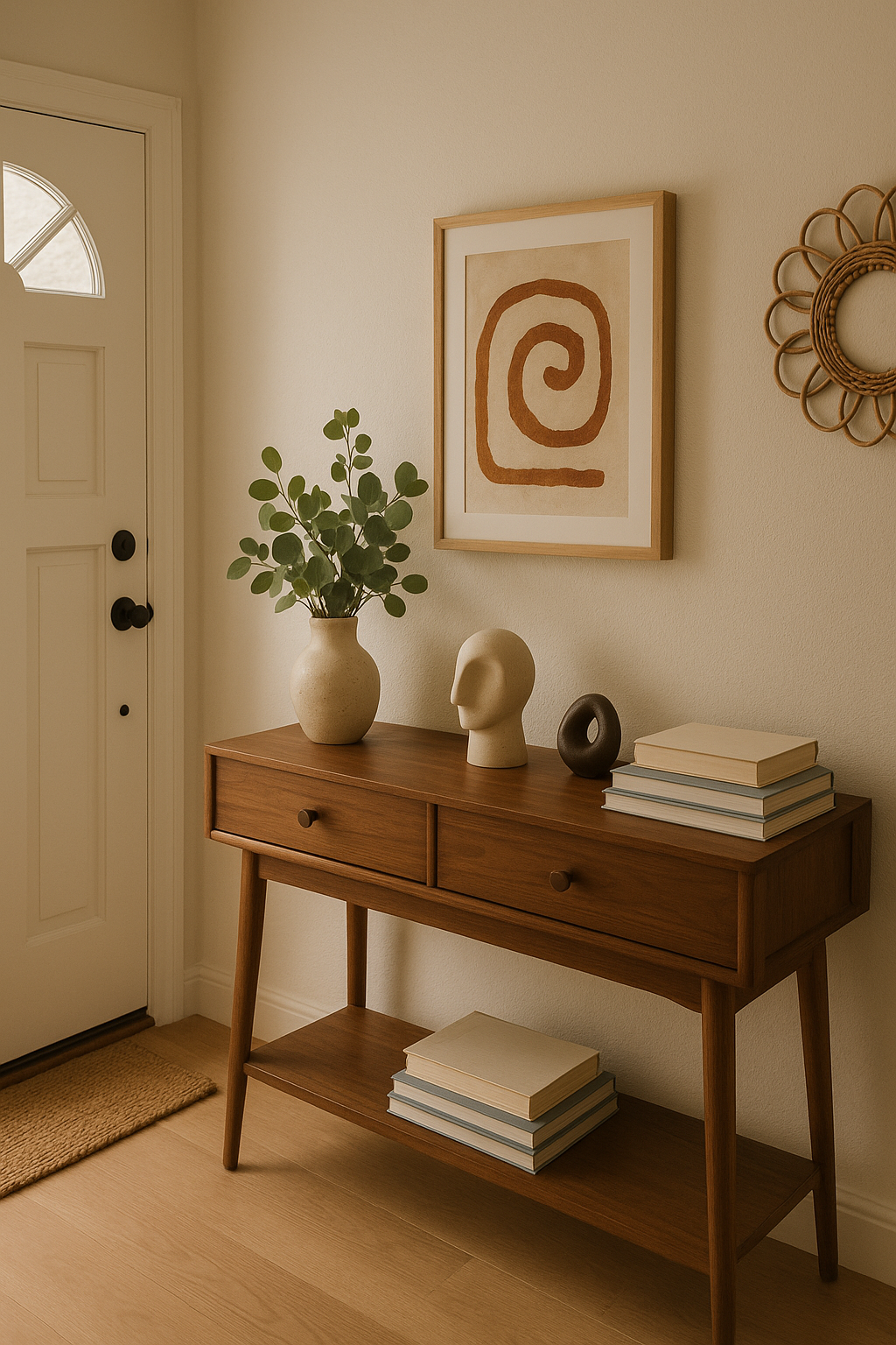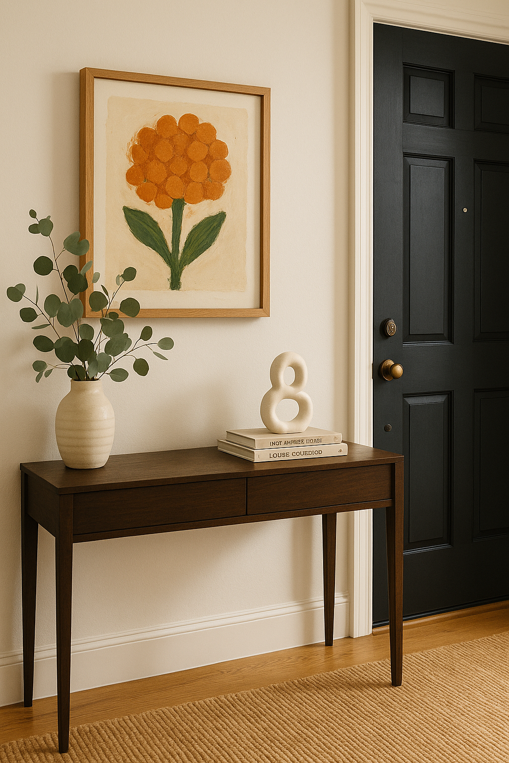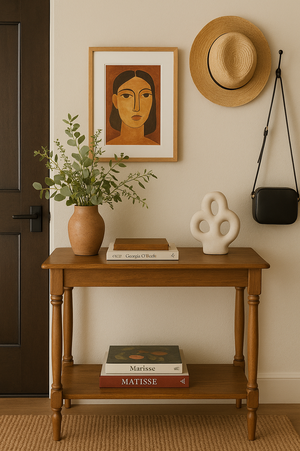 - Entryway art and decor: Small sculptural items or a stack of favorite books
