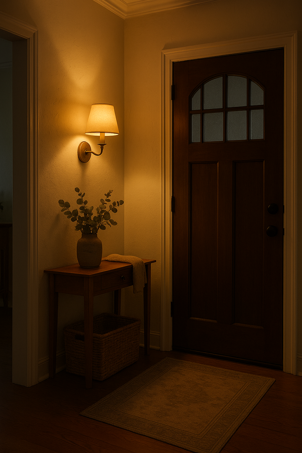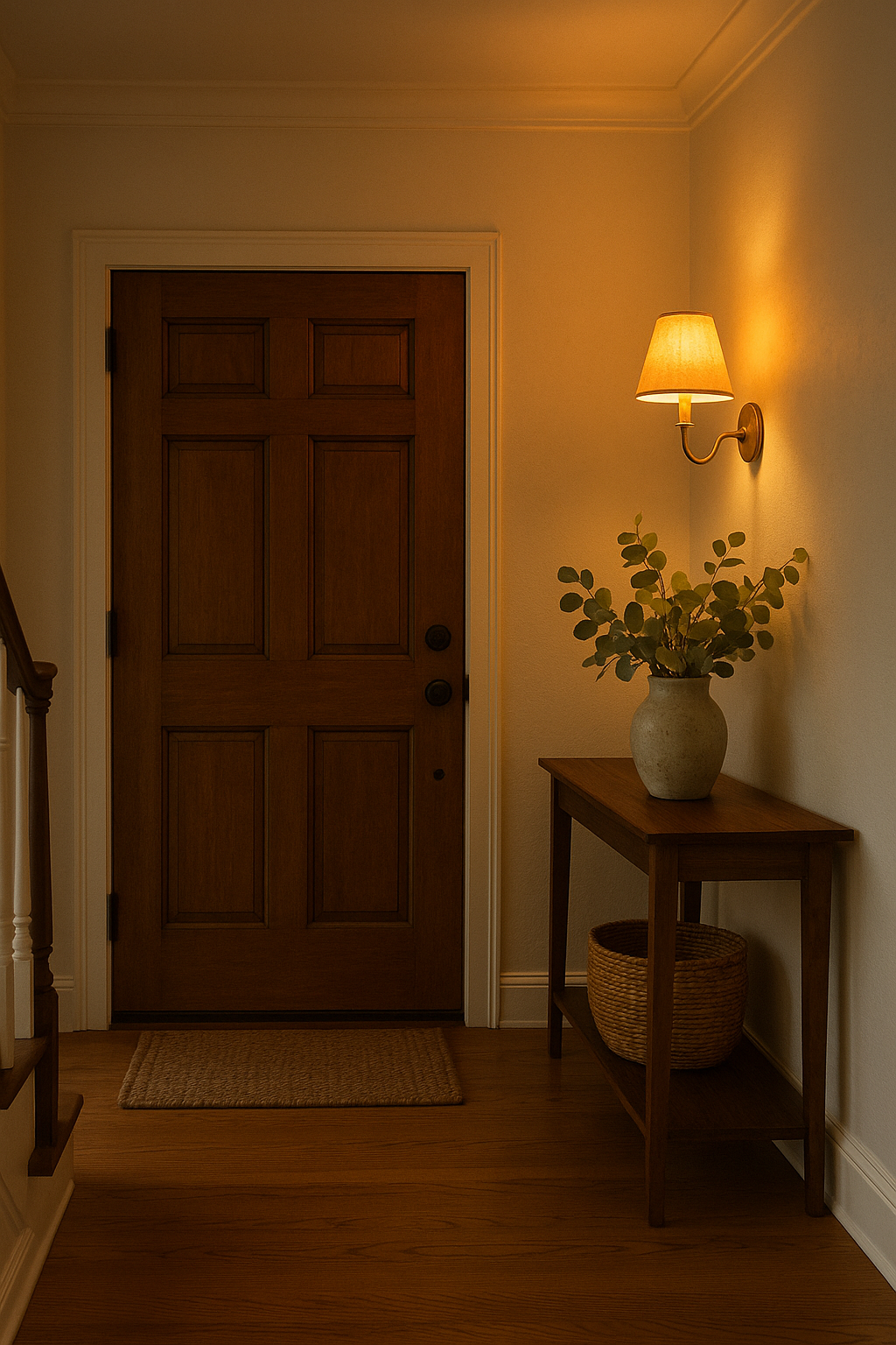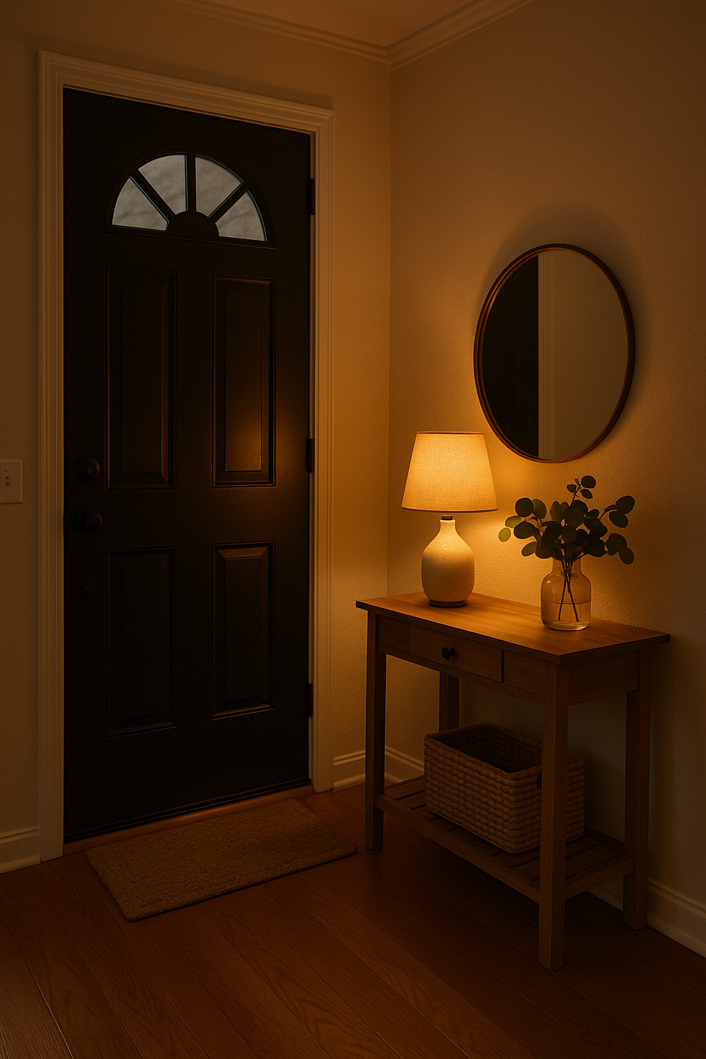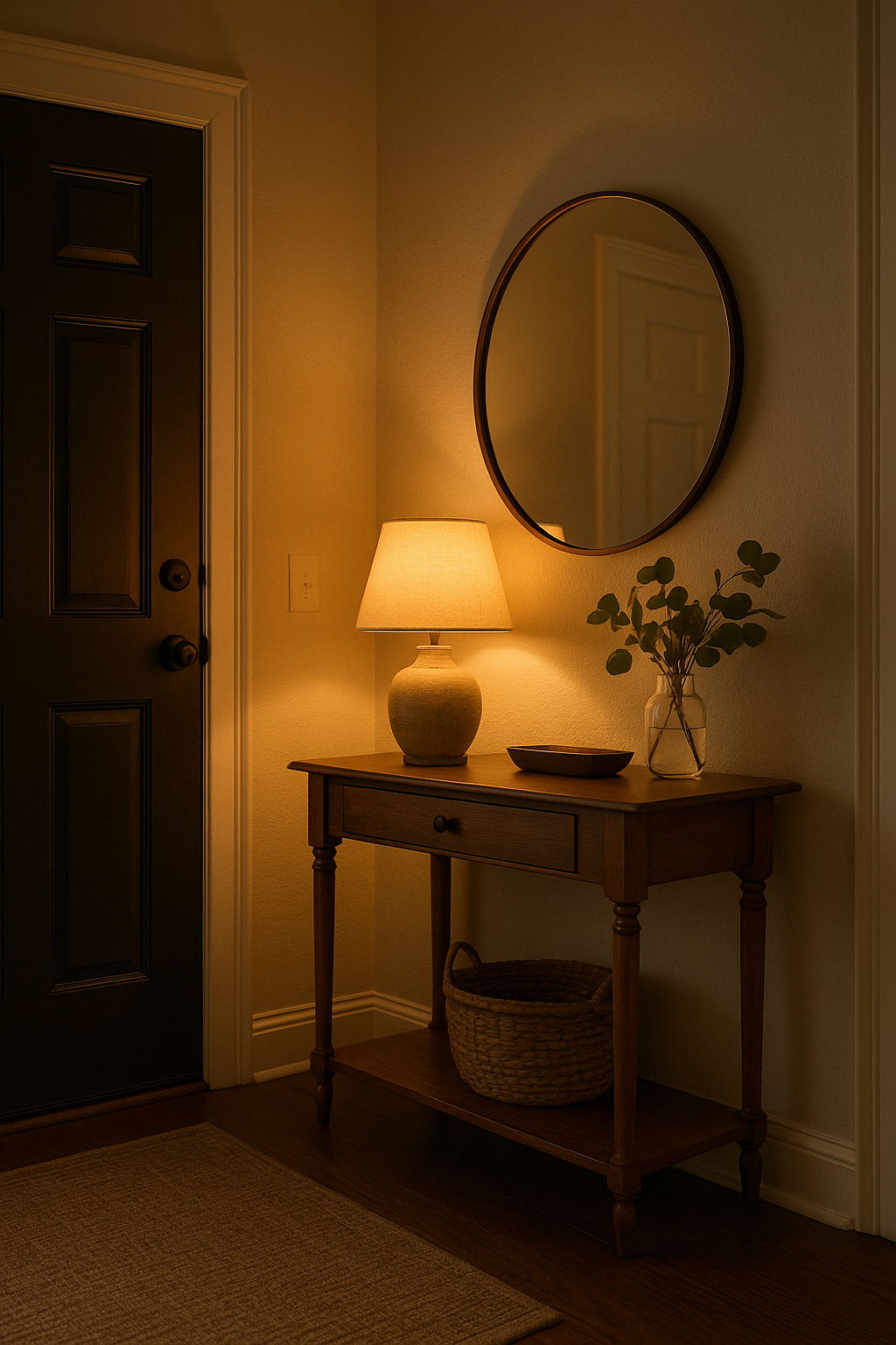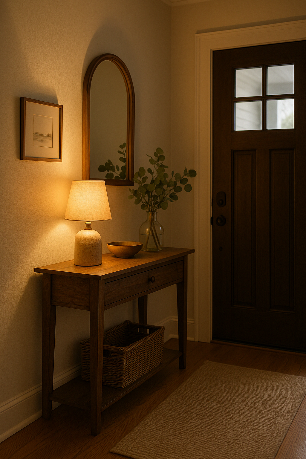 - Warm entryway glow: A small table lamp with a warm-toned bulb