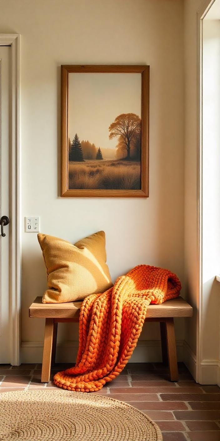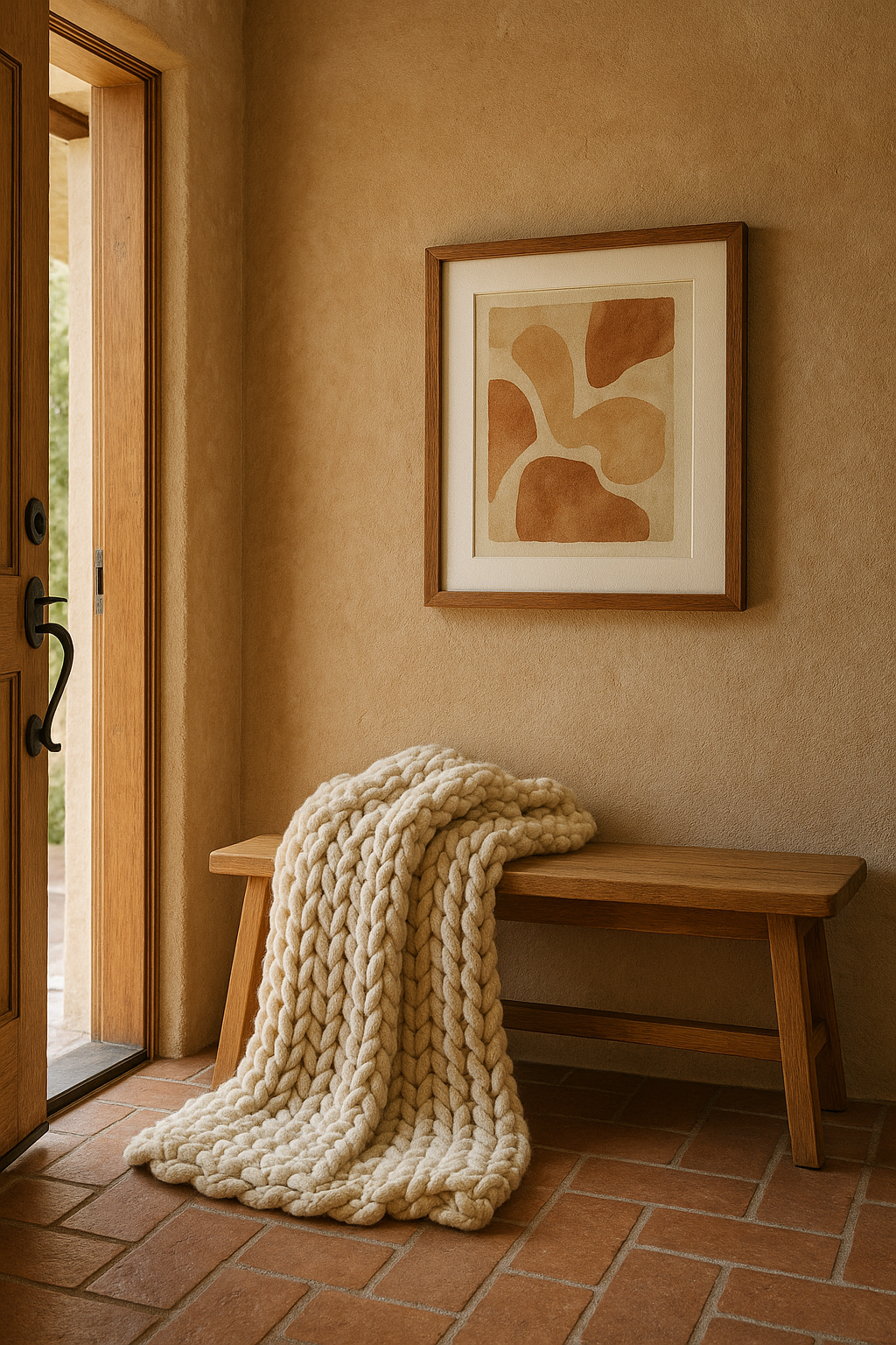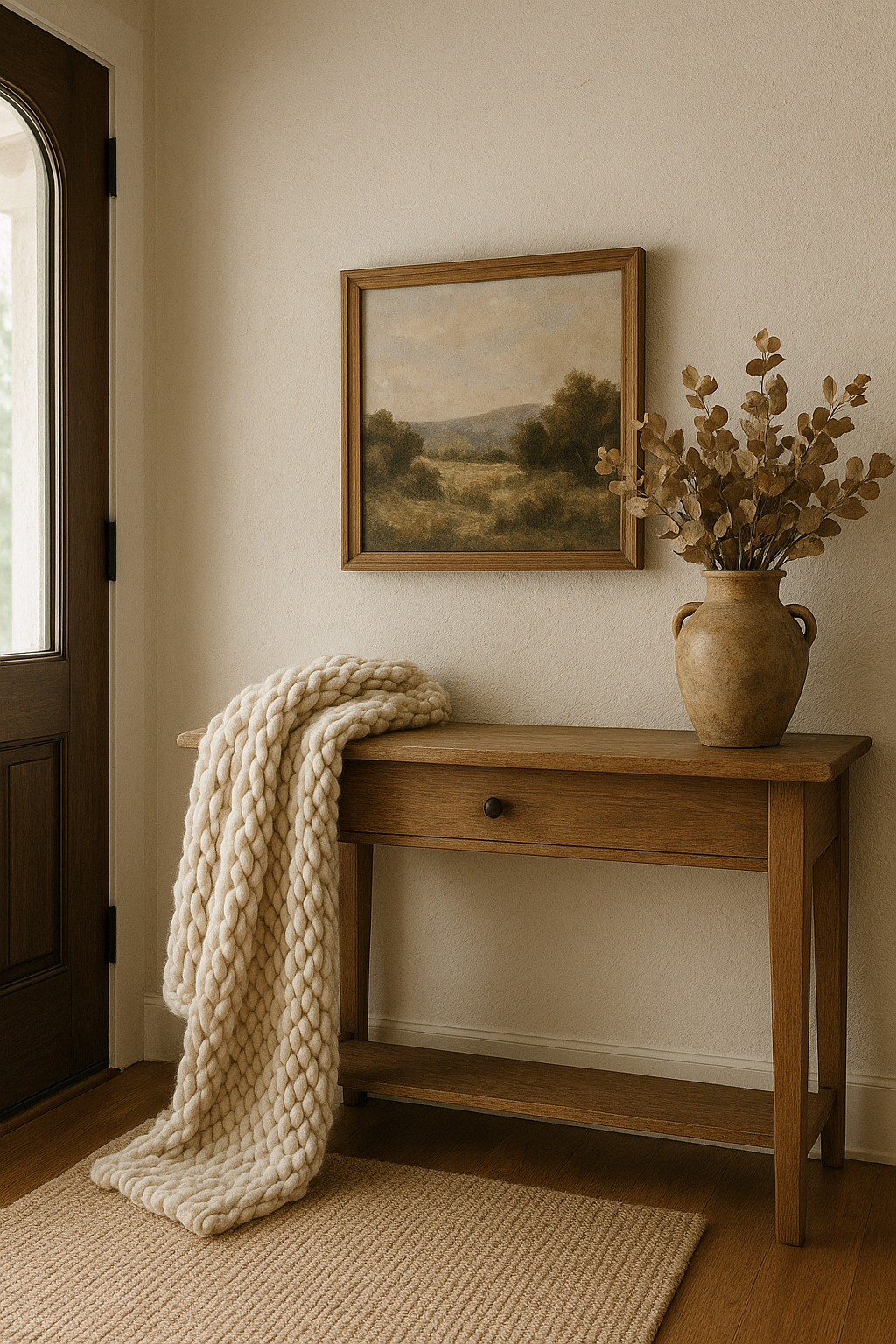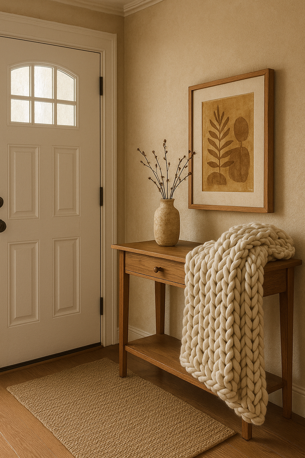 - Textured entryway design: A chunky knit throw or wood-framed artwork
